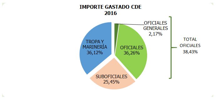 El crédito asignado en concepto de CDE se repartió un 38,43% entre oficiales, otro 25,45% entre suboficiales y el restante 36,12% entre los militares de tropa y marinería.