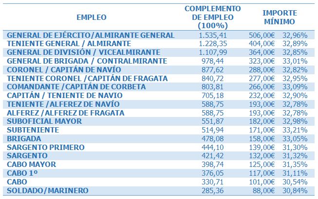 Además, ni todos los efectivos lo cobran ni todos los empleos llegan a todos los porcentajes. El empleo militar es un factor decisivo para percibir o no esta retribución. La variedad de situaciones excede de estas líneas, pero sirva como ejemplo que hay unidades en las que sólo la mitad de los suboficiales pueden cobrar el 35% y los oficiales lo cobran todos, percibiendo la mitad el 35% y la otra mitad el 60%. En este caso el comandante llegaría a cobrar anualmente 5.787 € y el brigada (si lo cobra) 2.008 €. Por tanto, hay una doble diferenciación por el empleo y por el porcentaje.