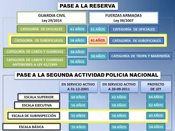 ¿Cómo se configura la reserva o situación similar en el entorno cercano? Mientras que los suboficiales de la Guardia Civil pasan a los 58 años, los subinspectores de la Policía Nacional, con estricto respeto a los afectados por cada uno de los sucesivos cambios legislativos, finalmente lo harán a los 60 años. Inexplicablemente, los suboficiales de las Fuerzas Armadas tienen la edad más elevada.