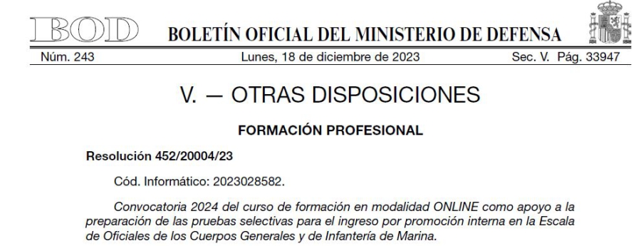 Recientemente el ministerio ha convocado el curso de formación en modalidad ONLINE como apoyo a la preparación de las pruebas selectivas para el ingreso por promoción interna en la Escala de Oficiales de los Cuerpos Generales y de Infantería de Marina.